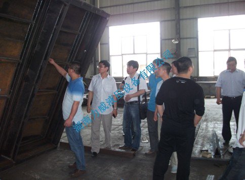 考察團領導與我廠員工,就節(jié)能型側(cè)翻式拍門相關生產(chǎn)問題進行了深入探討。